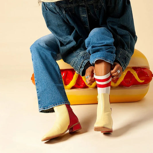 Botines amarillos con tacón grueso, punta cuadrada y cremallera en bloques de color [pedido por adelantado]