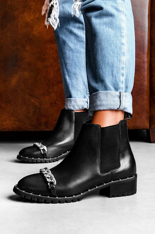 Botas negras de tacón grueso con punta redonda y decoración de cadena de metal [pedido por adelantado]