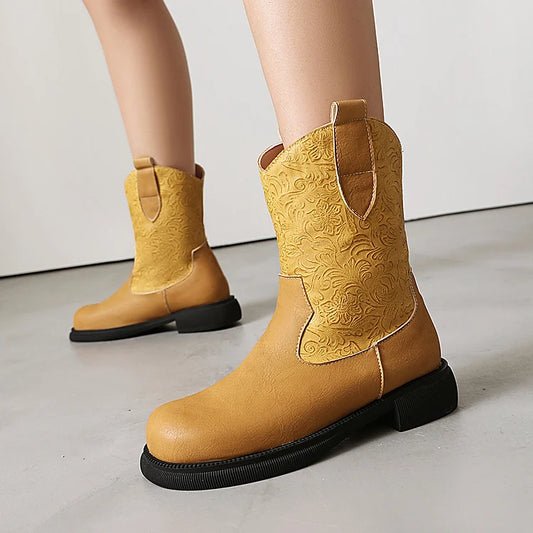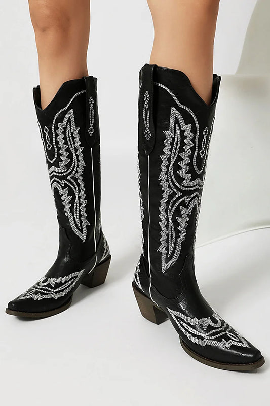 Botas vaqueras con tacón grueso y punta puntiaguda, bordados y parches