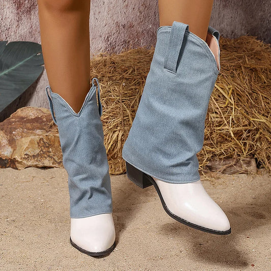 Botas de media caña con tacón grueso y punta puntiaguda con diseño de patchwork de mezclilla