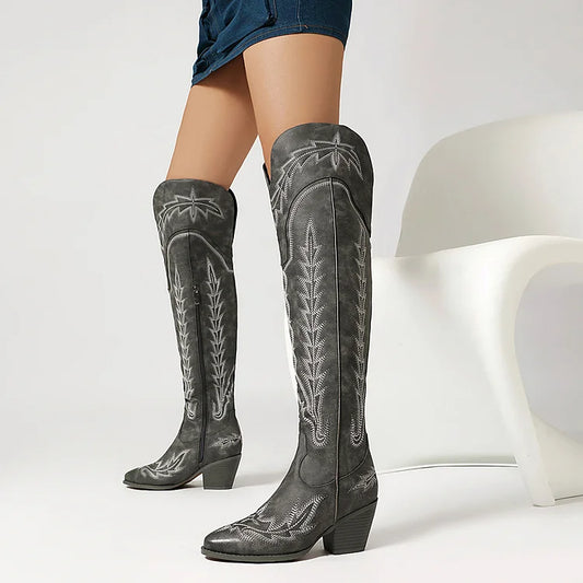 Botas por encima de la rodilla con tacón grueso, punta puntiaguda, cremallera y corte en V con bordado