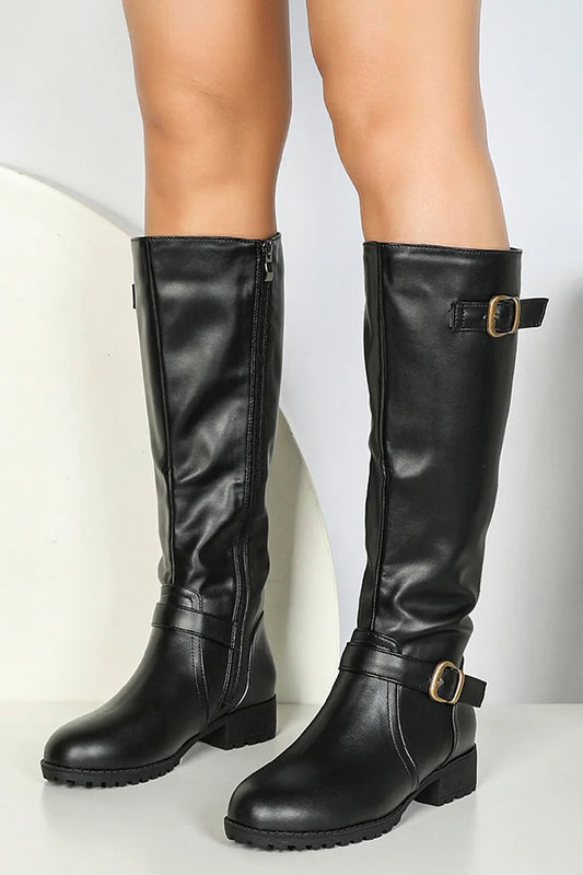 Botas altas hasta la rodilla con cremallera y decoración de patchwork con hebilla y correa de punta redonda