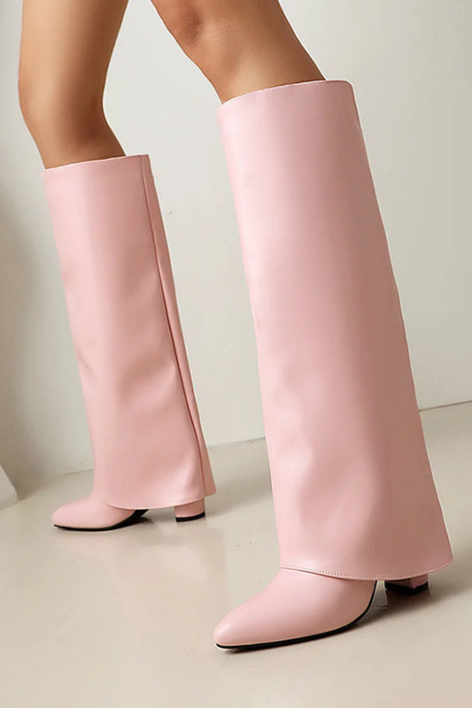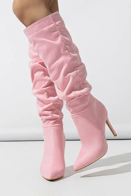 Botas altas hasta la rodilla con tacón grueso y punta puntiaguda de color liso y pliegues