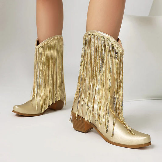 Botas de tacón grueso con punta puntiaguda y ribete de flecos con brillo metálico
