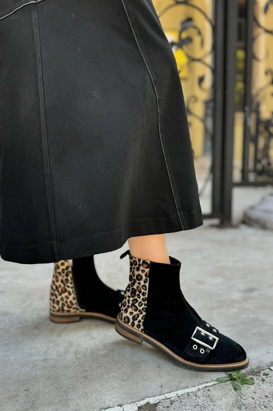 Botines negros con punta puntiaguda, hebilla y tiras con estampado de leopardo [pedido por adelantado]