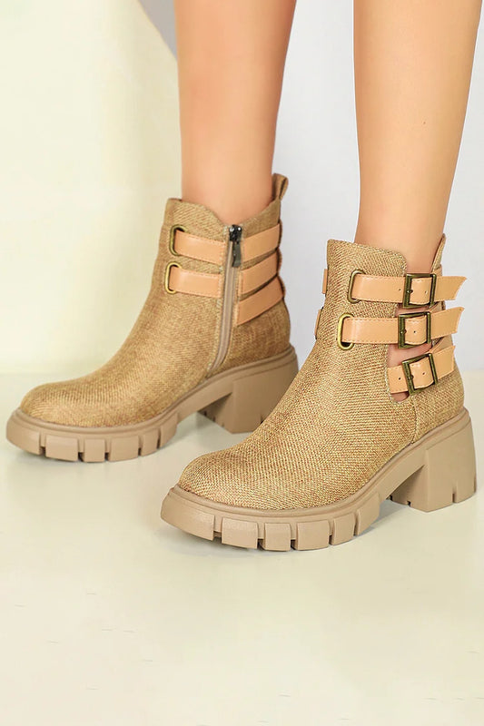 Botines de tacón grueso con punta redonda, cremallera y hebillas con múltiples correas