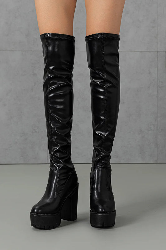 Botas por encima de la rodilla con plataforma, tacón de aguja y punta redonda con parches