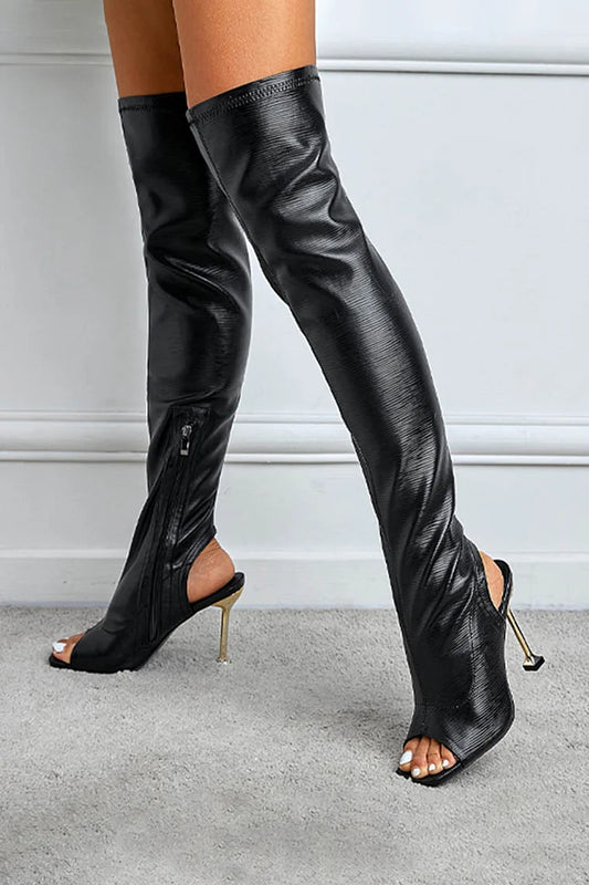 Botas por encima de la rodilla con tacón de aguja, tira trasera y cremallera en color liso y puntera abierta