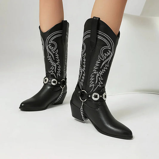 Botas de media caña con tacón grueso y punta puntiaguda con decoración de cadena y anilla bordada