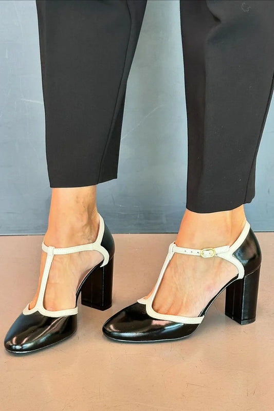 Tacones negros gruesos con hebilla y tira en T y bloques de color y punta redonda [pedido por adelantado]