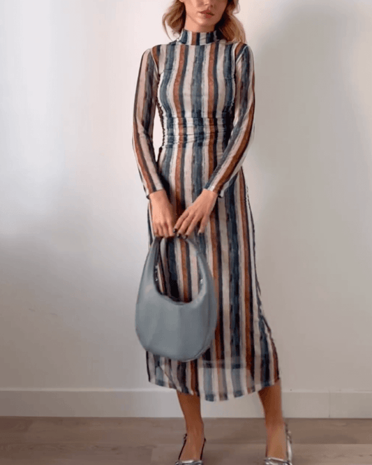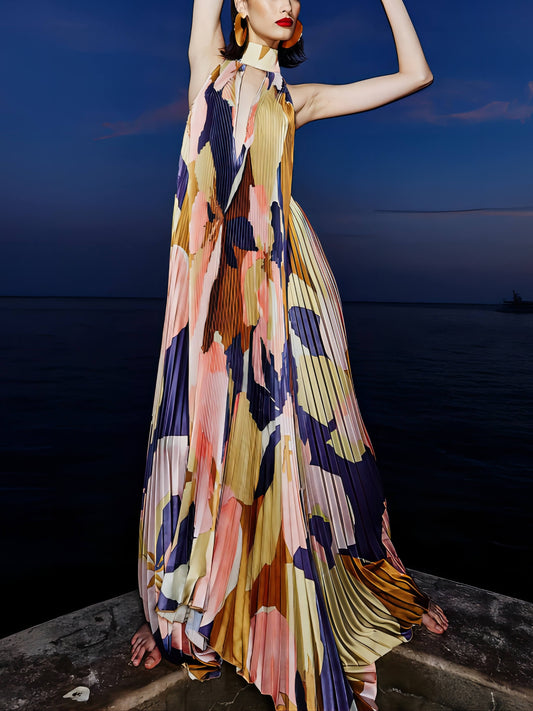 Elegante vestido midi plisado con escote halter, tirantes y espalda descubierta