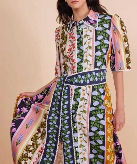 Vestido midi de una sola botonadura con escote en V y flores delicadas