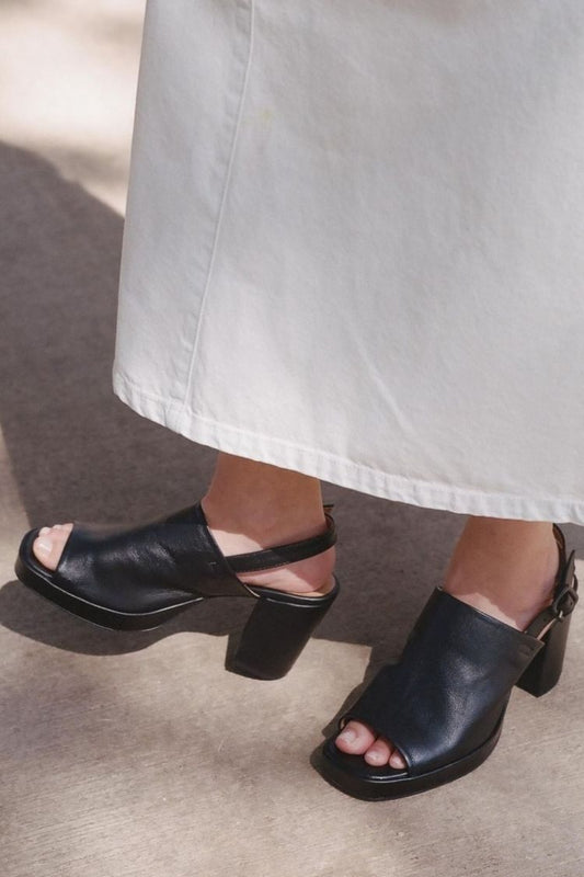 Zapatos de tacón de bloque con punta abierta de cuero negro [Reserva]