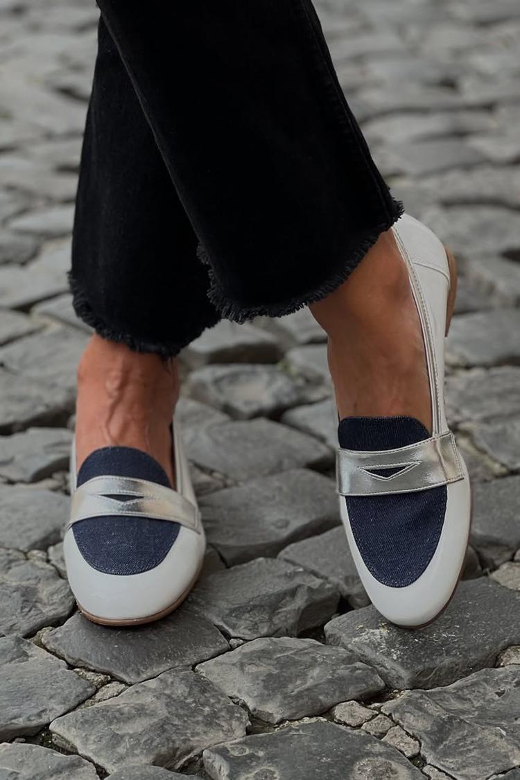Mocasines blancos de punta redonda con parches y brillo metálico [Reserva]