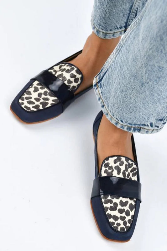 Mocasines azul marino con punta cuadrada y estampado animal de patchwork [Reserva]