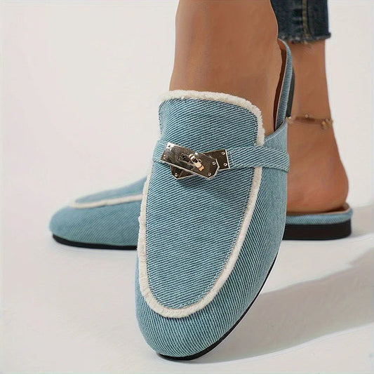 Mules de mezclilla con punta redonda y adorno de piel con hebilla de aleación