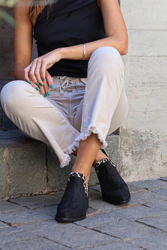 Botines negros con punta puntiaguda y diseño de patchwork con estampado animal [Pre-pedido]