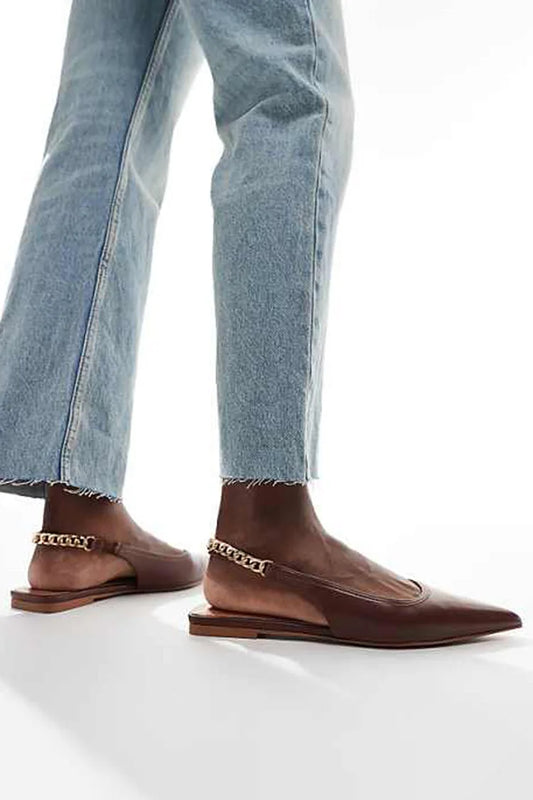 Zapatos planos marrones de color liso con punta puntiaguda y tiras de cadena de aleación [Pedido anticipado]