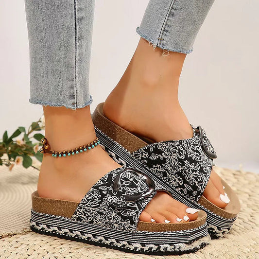 Pantuflas informales con plataforma y punta redonda con decoración de hebilla metálica y estampado integral