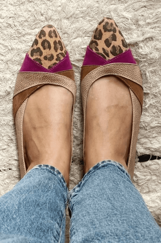 Estampado animal Bloques de color Correa Hebilla Punta puntiaguda Zapatos planos marrones