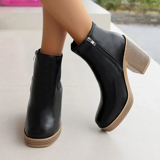 Botines de tacón grueso con punta redonda y diseño de patchwork y cremallera
