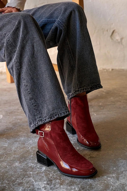 Botines burdeos con tacón grueso y cremallera en punta redonda y parches [pedido por adelantado]