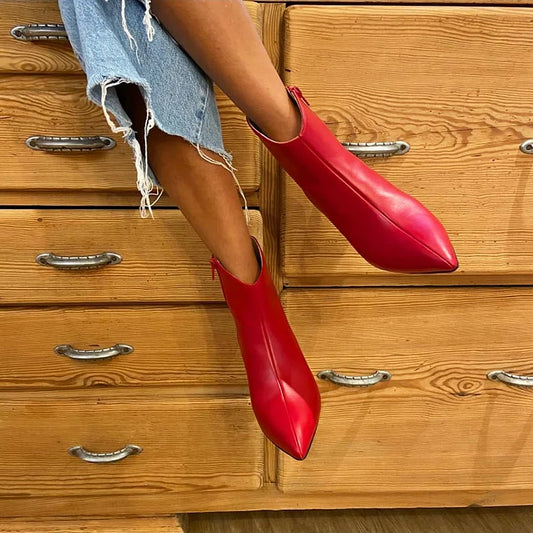 Botines rojos de tacón bajo con punta puntiaguda y cremallera en color liso [pedido por adelantado]