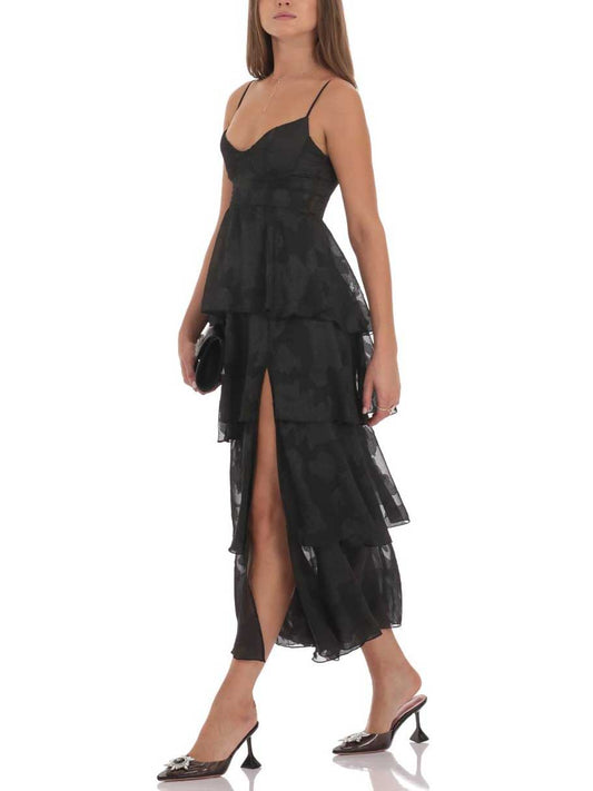 Elegante vestido midi con volantes y estampado floral en jacquard
