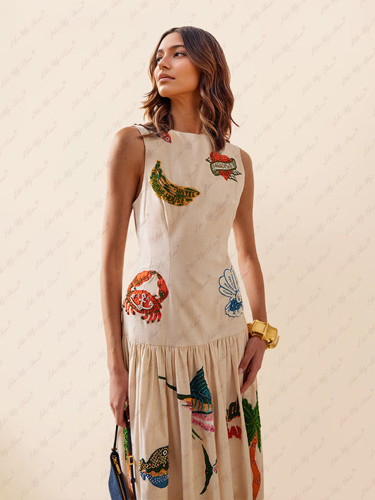 Vestido midi con espalda fruncida y estampado único en mezcla de lino Feel Effortfully