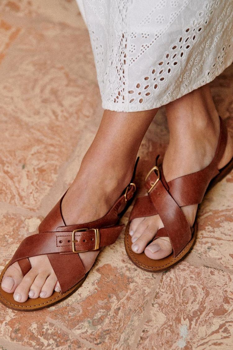 Sandalias marrones con hebilla y tiras cruzadas, de color liso y con anilla para el dedo del pie [Reserva]