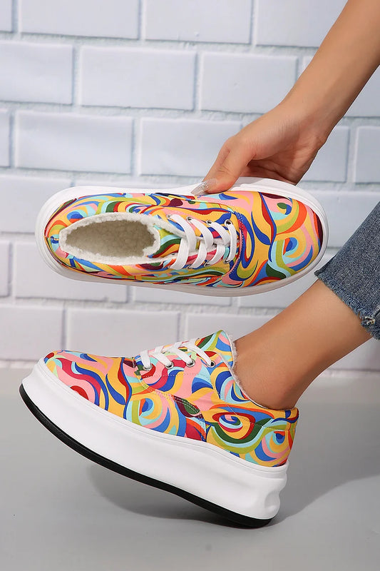 Baskets multicolores à imprimé abstrait, doublées en fausse fourrure, à bout rond et lacets
