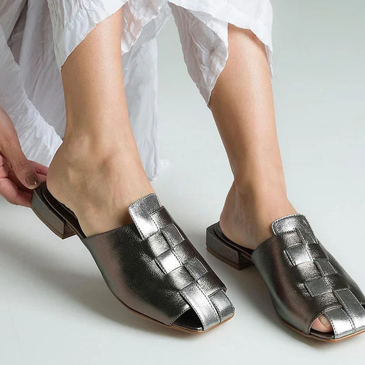 Mules argentées à bout carré tissées aux reflets métallisés [Pre Order]