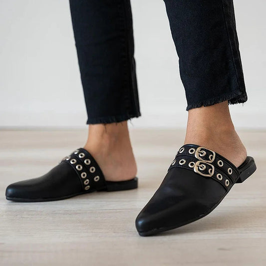 Oeillets Sangles Boucles Décor Bout Pointu Mules Noires