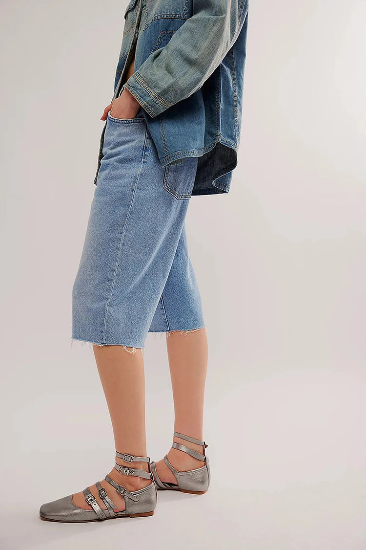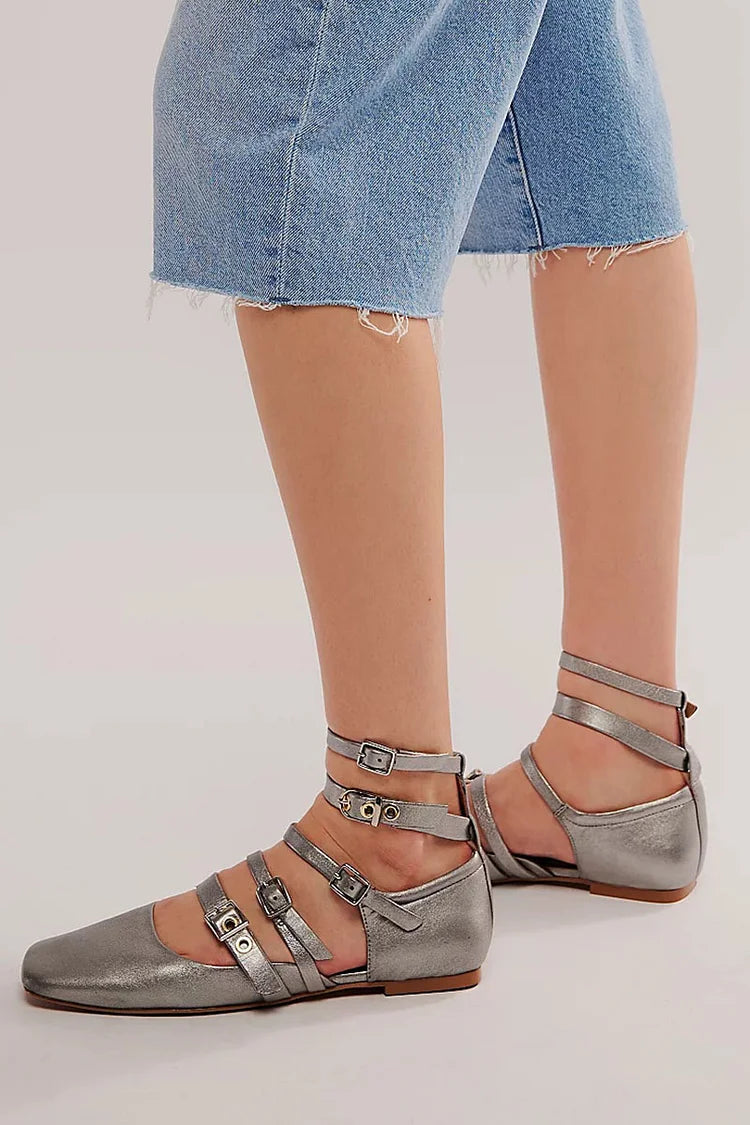 Ballerines argentées à éclat métallique, bout carré, boucles à multiples sangles sur mesure [Précommande]
