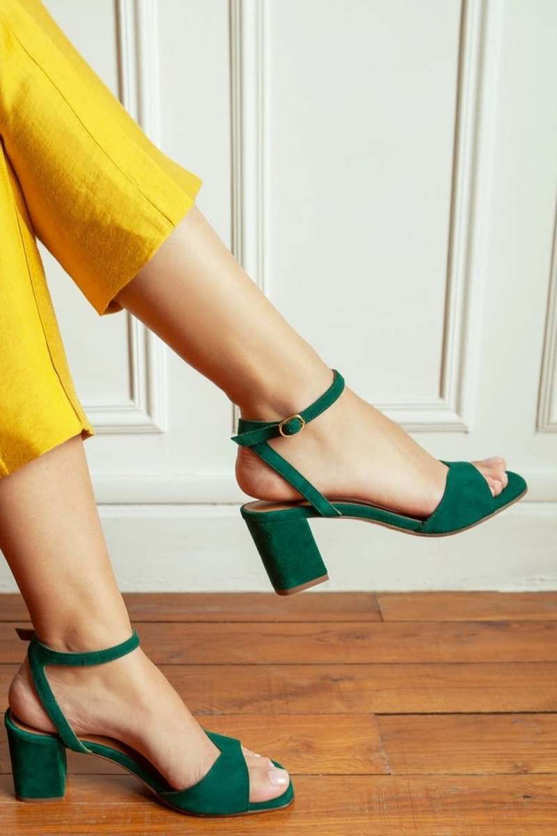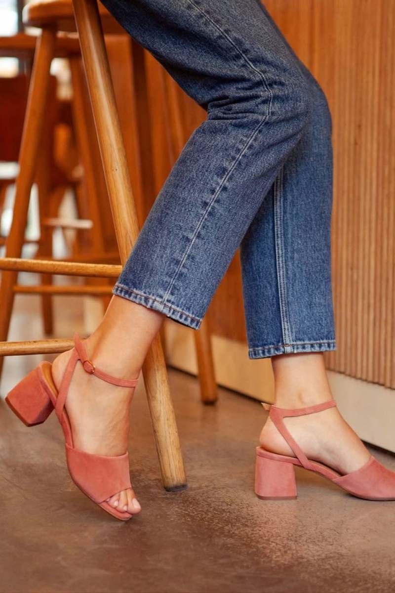 Sandales à talon bloc ouvertes à bout ouvert avec bride cheville en daim [Précommande]