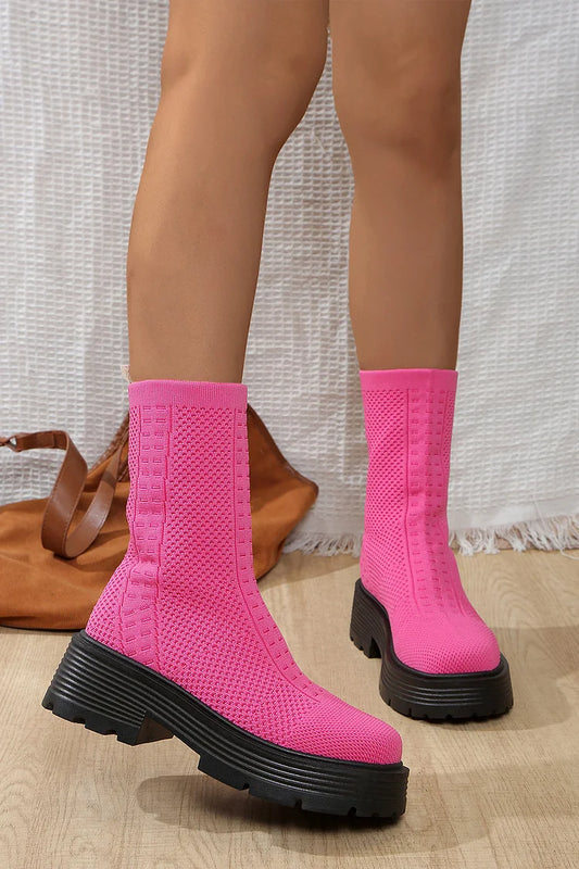 Stivali con punta tonda, tacco grosso, lavorati a maglia testurizzata e calza infilabile