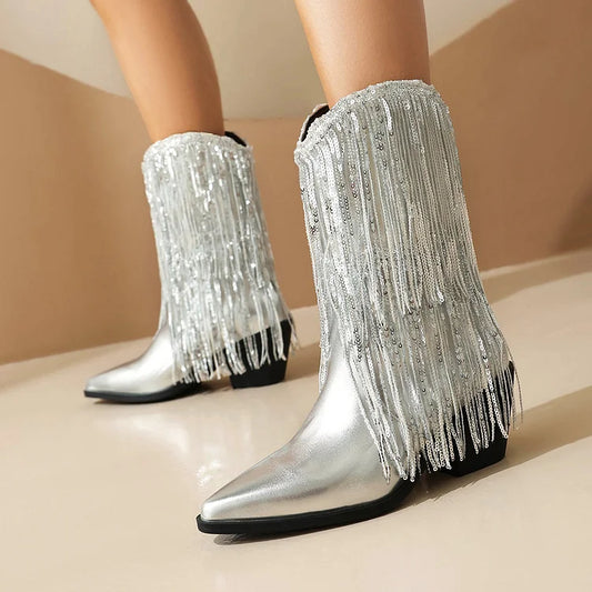 Stivali western con tacco grosso, punta affilata, decorazioni con frange di paillettes e lucentezza metallica