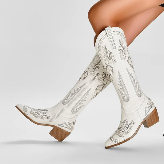 Stivali alti fino al ginocchio con tacco grosso e punta affilata, motivo tribale ricamato