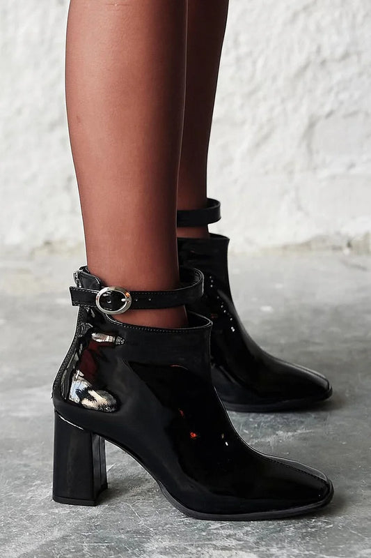 Stivali con punta quadrata, cinturino con fibbia e tacco grosso neri [Pre-ordine]