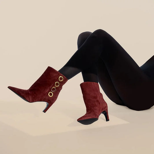 Stivali con tacco bordeaux, punta affilata e decorazione ad anello in metallo [Pre-ordine]