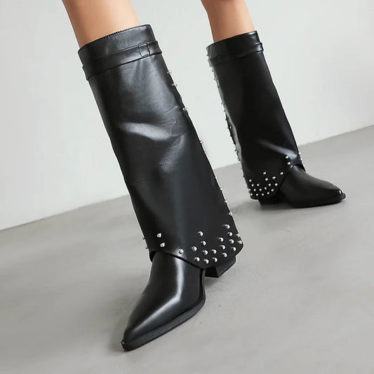 Stivali a metà polpaccio con punta affilata, tacco grosso e rivetti metallici decorativi