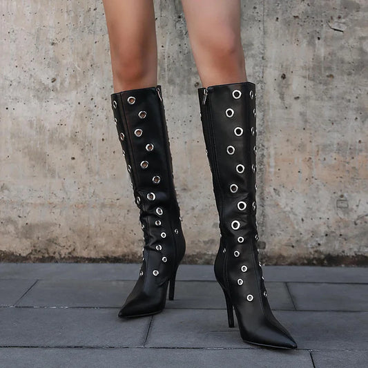 Stivali alti fino al ginocchio con tacco a spillo, cerniera decorativa, punta affilata e occhielli in metallo