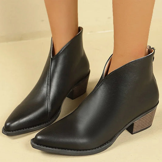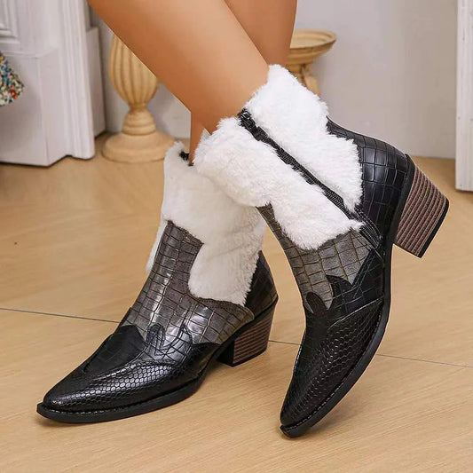 Stivaletti alla caviglia con tacco spesso, punta affilata, cerniera e patchwork in tinta unita