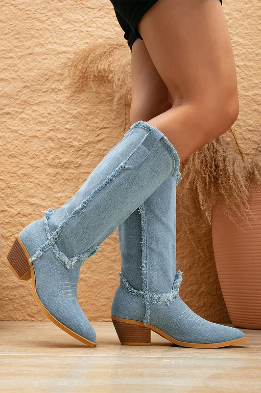 Stivali a metà polpaccio con punta affilata, tacco spesso, dettagli in denim e bordo grezzo