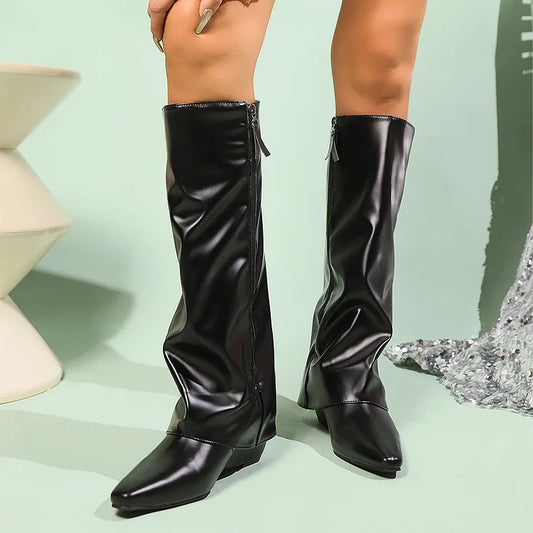 Stivali alti al ginocchio con tacco a zeppa e punta a punta, tinta unita e pieghevoli