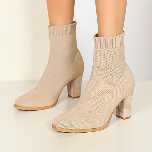 Stivaletti alla caviglia con tacco spesso e punta a punta in maglia tinta unita