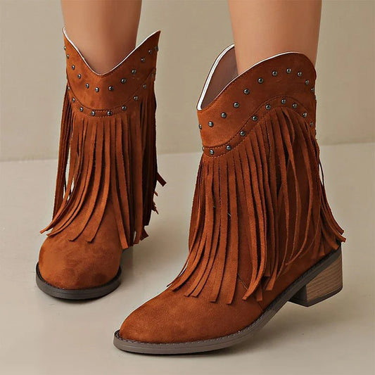 Stivali con tacco medio, punta affilata, frange decorative, rivetti in metallo
