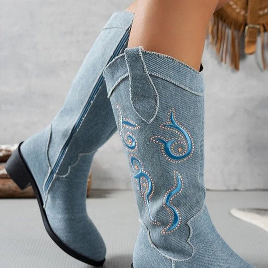 Stivali a metà polpaccio con tacco spesso, punta affilata, cerniera e ricamo strass