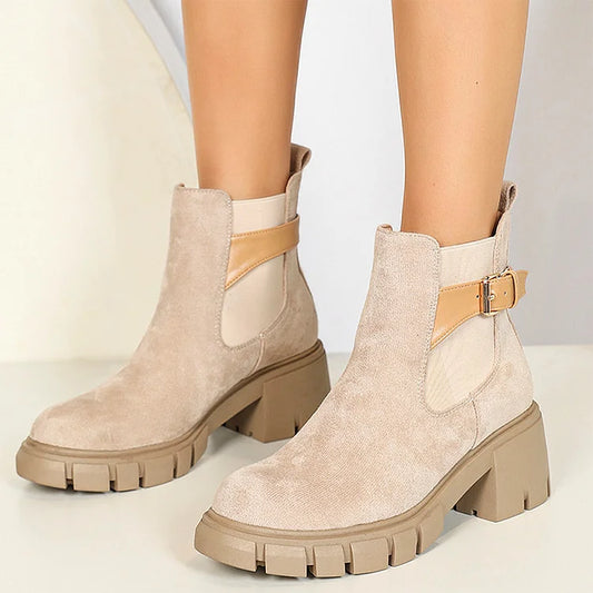 Stivaletti alla caviglia con cinturino patchwork, fibbia, punta rotonda e tacco spesso