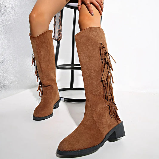 Stivali alti al ginocchio con tacco spesso e punta affilata, tinta unita, con patchwork di frange
